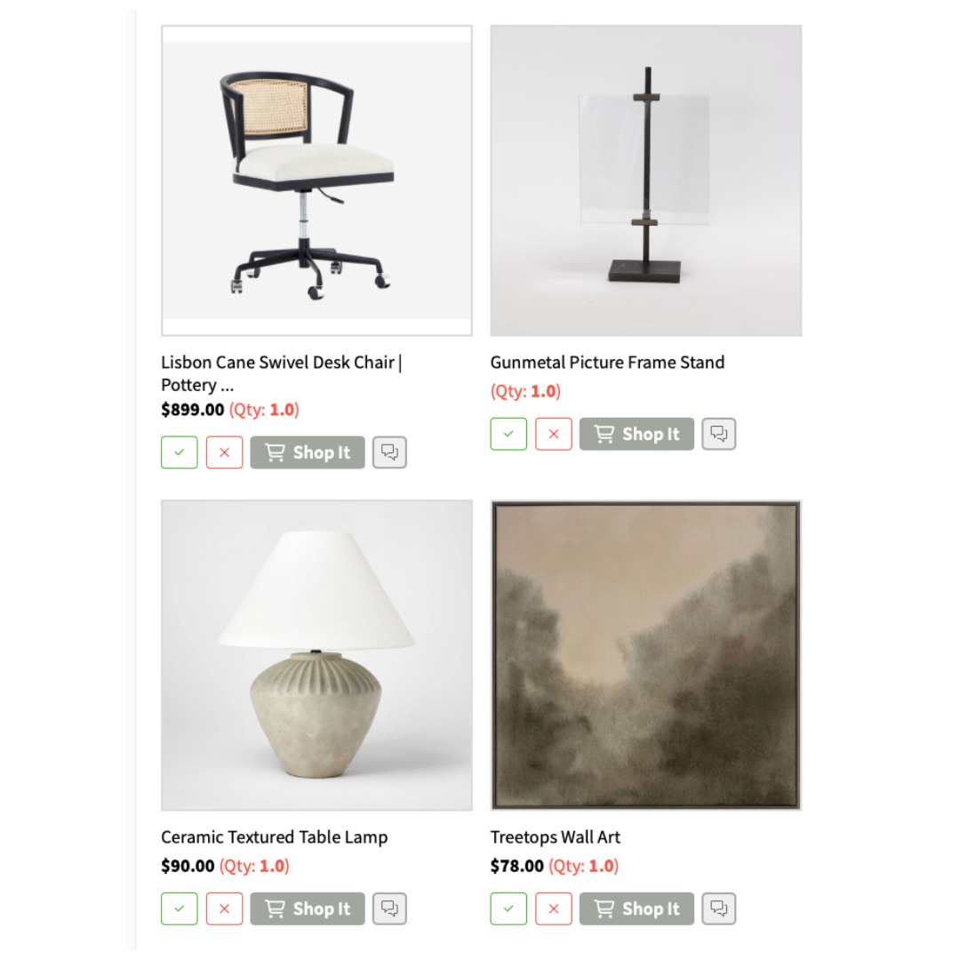 Once the designs are complete they are accessible in our portal system for viewing and include the following deliverables: space plan options, a 2D design board for each space, a design rationale explaining the design in detail, and a full product shop list specifying size, quantity, and color. These products are all retail-ready items, and have an add to cart button, making your shopping experience seamless to purchase at your own pace.